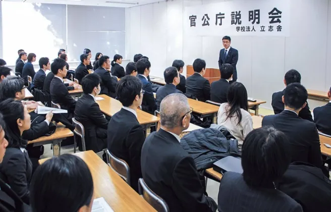 強さの秘密は、学生一人ひとりの進路に向き合う、立志舎の就職指導プログラム。民間企業への就職対策はもちろん、公務員試験に向けた対策も1年次から積極的に実施。学内企業説明会や就職セミナー、官公庁説明会など、業界分析や企業研究の機会もたくさん用意しています。